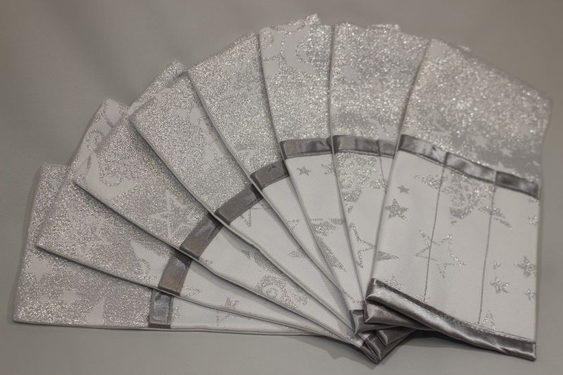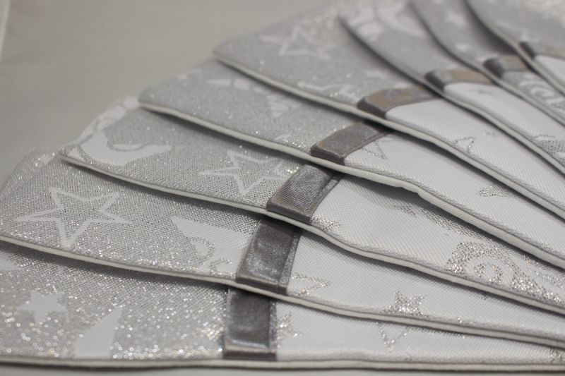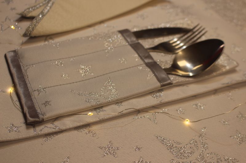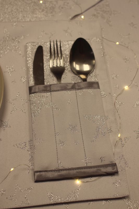 Az evőeszköz tartó többrétegű, kívül-belül a csillagos textilből készült egyszínű hátlappal, mely a tartás érdekében egy vatelin bélést is kapott. A három részre osztott tartó alsó és felső része szatén ferdepánt szegést kapott a még elegánsabb megjelenés érdekében.