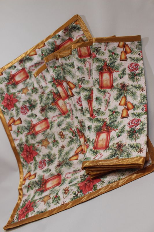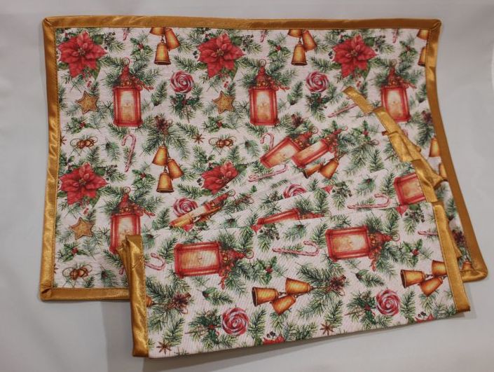A tányéralátétet ferdepánttal szegtük a még esztétikusabb megjelenés érdekében. Hátulja egyszínű piros színt kapott, így használható mindkét oldala is.